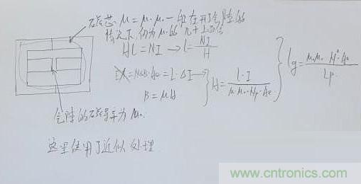 上面做了近似,近似所有的磁場能量都儲存在氣隙里面,因?yàn)榇判镜拇艑?dǎo)率很高,氣隙的磁場強(qiáng)度是磁芯的幾時(shí)到幾百倍,所以,近似磁芯為磁路短路,磁回路長度近似為氣隙長度。