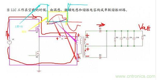 注意不同顏色畫的驅(qū)動、Vds、電流波形。諧振腔電流紅色的是諧振腔總電流,紫色的是勵磁電流,因?yàn)榇渭壎O管導(dǎo)通,Lm端電壓被鉗位到n*(Vout-Vf),所以勵磁電流是線性上升的。