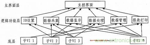 我們采用自頂向下的設計方式,將系統(tǒng)分為3層:主界面層、邏輯功能層和底層。“主界面層”主要包括主人機界面和系統(tǒng)總體控制。“邏輯功能層”負責系統(tǒng)的各種邏輯功能,例如I/O設置、數(shù)據(jù)采集、數(shù)據(jù)處理、數(shù)據(jù)管理和數(shù)據(jù)查詢等。“底層”則是一個個按照基本功能劃分子VI,供給高層次VI調用。采用調用子VI的形式來實現(xiàn)模塊之間的調用和關聯(lián)。當調用子VI時,系統(tǒng)需要花費很少的開銷,大概幾十毫秒的時間。測試系統(tǒng)的軟件層次結構圖3所示。