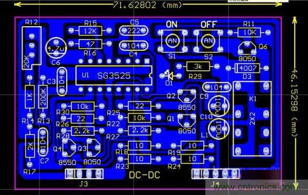 DC-DC升壓驅(qū)動板,采用的是很常見的線路,用一片SG3525實現(xiàn)PWM的輸出,后級用二組圖騰輸出,經(jīng)實驗,如果用一對190N08,圖騰部分可以省略,直接用3525驅(qū)動就夠了。板上有二個小按鈕開關(guān),S1、S2、S1是開機的,S2是關(guān)機的,可以控制逆變器的啟動和停機。