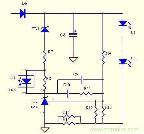 優(yōu)點(diǎn):電路簡單,元器件少,成本低,跟上面電路相比,顯著降低了取樣電阻的功耗,恒流精度很高,克服了上面的電路不能空載的致命缺陷,當(dāng)有個別LED擊穿時,可以自動調(diào)整輸出電壓。