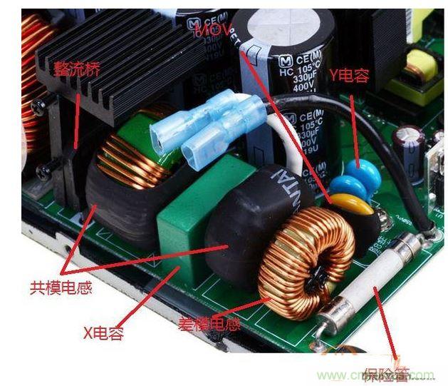 從圖3可以看到X電容、Y電容、共模電感、差模電感、保險(xiǎn)管、MOV。他們的分工如下: