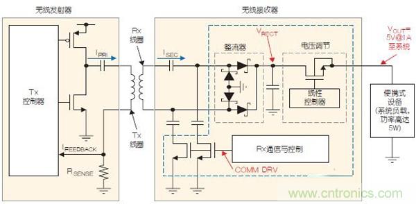 典型的無(wú)線電源系統(tǒng)(圖2)在便攜式設(shè)備內(nèi)有一個(gè)接收器(Rx),它提供能量給電池充電。發(fā)射器(Tx)位于一個(gè)固定的底座內(nèi),并連接至壁掛式電源。輸入電能轉(zhuǎn)換為交流電,然后在發(fā)射器線圈與接收器線圈非常接近時(shí),通過(guò)線圈發(fā)生磁耦合。接收器的輸出在電流高達(dá)1A時(shí)通常為5V,其可為便攜式設(shè)備內(nèi)的電池充電器IC提供輸入功率。