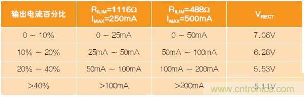 該器件系列具有動(dòng)態(tài)整流器控制功能以改善負(fù)載瞬態(tài)特性(表2)。Qi標(biāo)準(zhǔn)有一個(gè)相對(duì)緩慢的全局反饋回路,最多可能需要100ms的時(shí)間來(lái)改變工作點(diǎn)。這意味著負(fù)載階躍會(huì)降低輸出電壓并引起系統(tǒng)復(fù)位。為了提供足夠的電壓應(yīng)對(duì)瞬態(tài)變化,在低負(fù)載時(shí)需要把VRECT工作點(diǎn)設(shè)高。該特性有助于負(fù)載階躍,但會(huì)降低輕載效率。為解決這個(gè)問(wèn)題,用動(dòng)態(tài)效率調(diào)節(jié)功能來(lái)調(diào)節(jié)輕載電壓,以適應(yīng)最大輸出負(fù)載。此外,還用一個(gè)電阻器來(lái)設(shè)定最大輸出電流。