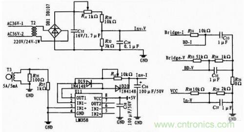 對于輸出電流取樣,本設(shè)計(jì)中使用了5 A/5 mA電流互感器。由于電流互感器的輸出為毫伏級的交流信號,為了能夠被單片機(jī)內(nèi)部AD模塊采集到,必須將其整流成直流信號并加以放大。而普通二極管整流電路對毫伏級電壓是無效的,因此,此處采用了由運(yùn)算放大器(U11,LM3 58)構(gòu)成的小電壓整流電路。實(shí)際測試表明,該電路有效解決了毫伏級信號的采樣問題。