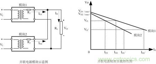 如果兩個模塊的參數(shù)完全相同時,即:VO1(max)= VO2(max)、R1=R2,則兩條負(fù)載特性曲線重合,能實現(xiàn)負(fù)載電流均勻分配。但在實際應(yīng)用中,兩個具有相同容量的模塊,VO1(max)與VO2(max)、R1與R2的參數(shù)也不可能完全做到相同。從圖 2可以看出,由于輸出到負(fù)載RL的等效阻抗R1、R2很小,輸出電壓即便出現(xiàn)很小的差別也會引起輸出電流很大的變化。例如:當(dāng)負(fù)載RL電流由IO= IO1+ IO2增大到IO、=IO1、+IO2、時,負(fù)載特性曲線斜率小的模塊1將承受大部分負(fù)載電流,模塊1將運行在滿載或過載限流狀態(tài),影響模塊的可靠性。