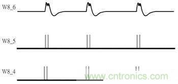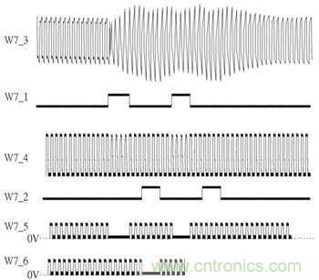 參照圖3錯動式訊號圖,W7_3為受電線圈訊號、W7_1與W7_2分別為P04與P11訊號、W7_4為S1訊號,其與W7_3不同在于通過一個C1電容之諧振效果后取得較強(qiáng)電流推力,其波形也會接近方波訊號;W7_5與W7_6分別為S12與S22訊號,從圖3中可看到設(shè)計中的調(diào)制訊號從線圈兩端分別進(jìn)行調(diào)制,并分成調(diào)制單端、解除調(diào)制、調(diào)制另一單端后再解除調(diào)制完成,此設(shè)計的用意在于對受電線圈接收電力影響最小的情況下,產(chǎn)生最大調(diào)制訊號。
