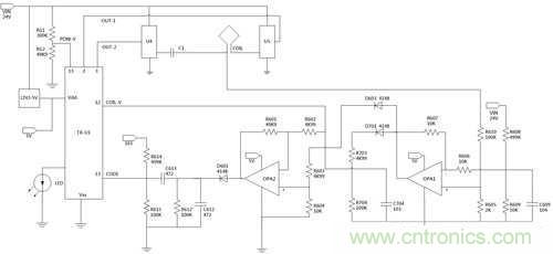 在圖4中由兩個運算放大器OPA1、OPA2構(gòu)成兩個差動放大電路,其OPA1動作為由R608與R609進(jìn)行分壓驅(qū)動電源作為差動參考點;另外,由R610與R605對線圈諧振訊號進(jìn)行分壓作為放大訊號輸入,在此有一配置為R608、R609與R610、R605之分壓比例皆為50比1,其用意在于取出與電源驅(qū)動電壓與諧振訊號中開關(guān)電壓失真相等后,透過差動放大出諧振訊號高于電源驅(qū)動電之成分進(jìn)行放大。