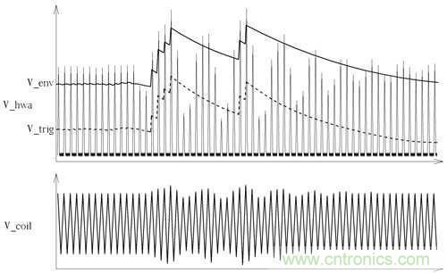 OPA2輸出訊號再傳送到D601、R612、C612為一檢波電路,參考圖6中經(jīng)過D601訊號為V_env該訊號為波峰訊號之檢波結(jié)果,但該訊號之直流穩(wěn)態(tài)非固定值,所以在透過C613、R614、R615構(gòu)成之去交連耦合電路得到之波形為V_trig,而該波型最后傳到TX-U1進(jìn)行解碼處理,在圖6中能看到原供電線圈上之訊號V_coil轉(zhuǎn)換到V_trig之差異。