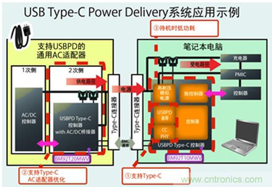 ROHM不僅擁有滿足以往的USB Type-A/B標準的USB PD控制IC(BD92S系列)產(chǎn)品,還新開發(fā)出滿足最新的USB Type-C標準Rev1.1和USB PD標準Rev2.0的USB PD控制IC(BM92T系列)。BM92T系列在以往僅可 供電10W左右的滿足Type-C標準的設(shè)備之間,可實現(xiàn)高達100W(20V / 5A)的供受電。由此,電腦和電視等需要 大功率的設(shè)備,也可通過USB端子供電來帶動(圖4)。