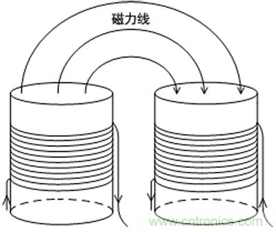 LC對(duì)噪聲和紋波抑制效果比較明顯,根據(jù)紋波頻率選擇合適電感電容值,但由于柱形電感價(jià)格低體積小的優(yōu)點(diǎn),所以一般LC中電感大都會(huì)選擇柱形電感,然而柱形電感是開(kāi)放式磁結(jié)構(gòu),對(duì)周?chē)鷷?huì)產(chǎn)生較嚴(yán)重磁干擾,我們可以采用兩個(gè)電感并排放置,且電流流入方向相反,即有助于引導(dǎo)磁通從一個(gè)磁柱到另一個(gè)磁柱,從而可以降低電磁干擾,如圖3所示。