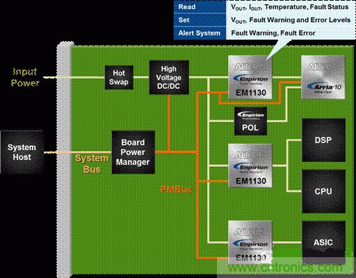 (2)另一常見(jiàn)的系統(tǒng)電源要求是能夠進(jìn)行遠(yuǎn)程監(jiān)視,對(duì)電源各參數(shù)進(jìn)行實(shí)時(shí)監(jiān)視、故障報(bào)警和相應(yīng)調(diào)節(jié)。而最簡(jiǎn)單、最便宜、最緊湊的方式是使用集成了遠(yuǎn)程監(jiān)視功能和相應(yīng)的通信總線的電源調(diào)節(jié)器。通過(guò)智能電壓ID(SmartVID)特性,Altera的Arria 10 FPGA和SoC通過(guò)PMBus接口,確定與Enpirion電壓調(diào)節(jié)器系統(tǒng)之間所需的VCC電壓和通信,將內(nèi)核電壓軌盡可能動(dòng)態(tài)調(diào)整到最小,而不會(huì)犧牲系統(tǒng)性能。同時(shí),支持PMBus的Enpirion的ED8101P0xQI單相數(shù)字控制器,與ET4040QI大電流電源配對(duì)使用,可實(shí)現(xiàn)對(duì)FPGA的多種遠(yuǎn)程監(jiān)視和低功耗特性。