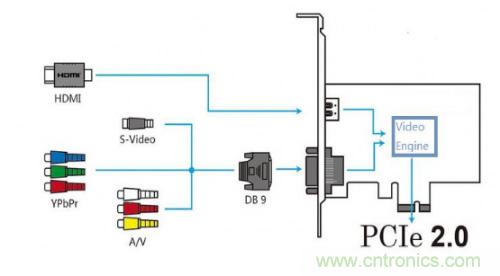 圖一是目前視頻采集卡非常主流的硬件架構(gòu),Vedio Engine包括視頻編解碼器和FPGA,協(xié)議以及算法都由FPGA來實現(xiàn),后面通過FPGA的Serdes接口送出到電腦,采用X4 PCIE2.0總線協(xié)議。世強市場經(jīng)理表示:PCIE總線發(fā)展到現(xiàn)在經(jīng)歷了3代,分別是GEN1 2.5GT/S, GEN2 5GT/S, GEN3 8GT/S,如果設(shè)置成X4,GEN2就可以滿足20GT/S的帶寬,基本可以滿足目前主流高清帶寬需求,所以主流的視頻采集卡都采用PCIE2.0。