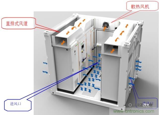 陽光電源箱式逆變房將逆變器、直流柜、通訊單元集成于一體,采用簡潔的分段直排式風(fēng)道,風(fēng)道內(nèi)不含風(fēng)機,零損耗,免維護。風(fēng)道長度僅1m,壓力損失小,風(fēng)機處于最佳效率狀態(tài)。逆變器在工作時,大部分熱量通過風(fēng)道排出集裝箱外,僅有少量熱量通過輻射傳到箱體內(nèi)部,內(nèi)部空氣吸收熱量后向頂部流動,再由集裝箱頂部排風(fēng)扇排出,確保了逆變器的長期可靠運行。