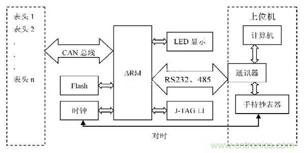 集中器通過CAN控制器發(fā)送讀表命令信號(hào)到總線上,每個(gè)表頭根據(jù)讀表命令將采集的信號(hào)通過CAN總線發(fā)送到集中器。集中器將采集的信號(hào)存儲(chǔ)在flash芯片中。上位機(jī)通過串口發(fā)送讀數(shù)據(jù)信號(hào)到集中器,集中器就把存儲(chǔ)在flash中的數(shù)據(jù)傳送給上位機(jī)。