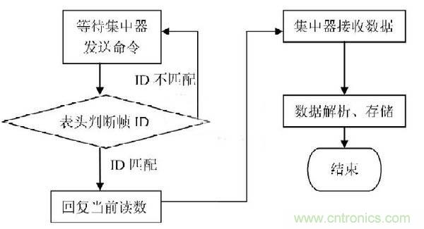 對(duì)時(shí)成功后,集中器繼續(xù)等待上位機(jī)的讀數(shù)命令或等待中斷讀數(shù)命令。當(dāng)收到讀數(shù)的命令后,定時(shí)讀數(shù)使集中器按設(shè)置的時(shí)間,自動(dòng)讀取表頭采集來的數(shù)據(jù);讀數(shù)使集中器讀取當(dāng)前表頭的數(shù)據(jù)。