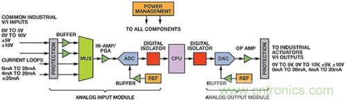 典型模擬I/O模塊包括2個(gè)、4個(gè)、8個(gè)或16個(gè)通道。為滿足嚴(yán)格行業(yè)標(biāo)準(zhǔn),這些模塊需要提供過壓、過流和EMI浪涌保護(hù)。大多數(shù)PLC包括ADC和CPU之間、CPU和DAC之間的數(shù)字隔離。高端PLC可能還有國(guó)際電工委員會(huì)(IEC)標(biāo)準(zhǔn)規(guī)定的通道間隔離。 很多I/O模塊包括每通道軟件可編程單端或差分輸入范圍、帶寬和吞吐率。