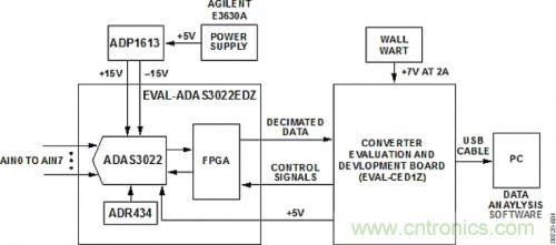 測(cè)試設(shè)置的功能框圖如圖4所示。ADP1613評(píng)估板由外部+5 V電源驅(qū)動(dòng),產(chǎn)生ADAS3022板所需的±15 V電壓。7 V直流壁式電源為EVAL-CED1Z板供電。EVAL-CED1Z板上的穩(wěn)壓器提供ADAS3022板所需的5 V電源。運(yùn)行交流測(cè)試時(shí),采用Audio Precision SYS-2702產(chǎn)生低失真輸入信號(hào)。