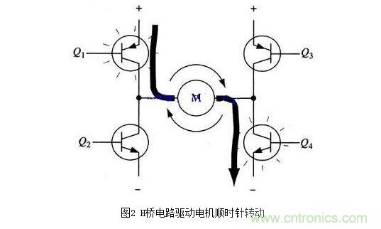 要使電機(jī)運(yùn)轉(zhuǎn),必須使對(duì)角線上的一對(duì)三極管導(dǎo)通。例如,如圖2所示,當(dāng)Q1管和Q4管導(dǎo)通時(shí),電流就從電源正極經(jīng)Q1從左至右穿過(guò)電機(jī),然后再經(jīng)Q4回到電源負(fù)極。按圖中電流箭頭所示,該流向的電流將驅(qū)動(dòng)電機(jī)順時(shí)針轉(zhuǎn)動(dòng)。當(dāng)三極管Q1和Q4導(dǎo)通時(shí),電流將從左至右流過(guò)電機(jī),從而驅(qū)動(dòng)電機(jī)按特定方向轉(zhuǎn)動(dòng)(電機(jī)周圍的箭頭指示為順時(shí)針?lè)较颍?/div>
