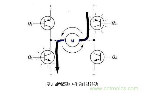 圖3所示為另一對(duì)三極管Q2和Q3導(dǎo)通的情況,電流將從右至左流過(guò)電機(jī)。當(dāng)三極管Q2和Q3導(dǎo)通時(shí),電流將從右至左流過(guò)電機(jī),從而驅(qū)動(dòng)電機(jī)沿另一方向轉(zhuǎn)動(dòng)(電機(jī)周圍的箭頭表示為逆時(shí)針?lè)较颍?/div>