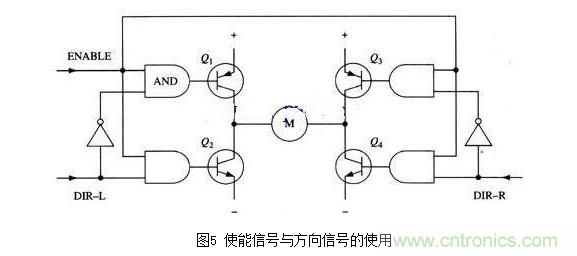 改進(jìn)電路在基本H橋電路的基礎(chǔ)上增加了4個(gè)與門和2個(gè)非門。4個(gè)與門同一個(gè)“使能”導(dǎo)通信號(hào)相接,這樣,用這一個(gè)信號(hào)就能控制整個(gè)電路的開(kāi)關(guān)。而2個(gè)非門通過(guò)提供一種方向輸人,可以保證任何時(shí)候在H橋的同側(cè)腿上都只有一個(gè)三極管能導(dǎo)通。(與本節(jié)前面的示意圖一樣,圖4所示也不是一個(gè)完整的電路圖,特別是圖中與門和三極管直接連接是不能正常工作的。)