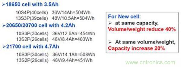 采用20700 /21700 /20650后,由于同等能量下,電池數(shù)量減少(以21700為例,減少1 /3),這會帶來整個Pack內(nèi)部金屬連接件數(shù)量的減少,這會進一步降低電池Pack的質(zhì)量。