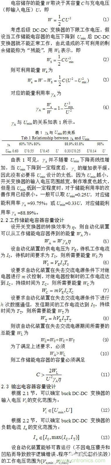 【導(dǎo)讀】為了在失電情況下繼續(xù)維持智能終端設(shè)備短暫工作,提出了一種基于電容儲(chǔ)能的自動(dòng)化終端備用開(kāi)關(guān)電源解決方案。論述了電路組成、下限工作電壓選取和儲(chǔ)能電容器容量設(shè)計(jì)方法。