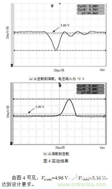 采用電阻器作為負(fù)載,并用開(kāi)關(guān)分別接入和斷開(kāi)進(jìn)行了從空載到滿載和從滿載到空載的實(shí)驗(yàn),輸出電壓的波形如圖4所示。