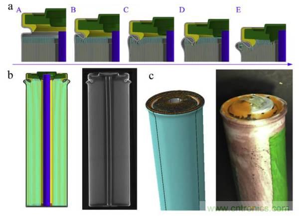 美國(guó)麻省理工學(xué)院的Juner Zhu等人利用18650電池研究了在發(fā)生軸向擠壓的過(guò)程中鋰離子電池的發(fā)生熱失控的機(jī)理,并利用有限元分析模型進(jìn)行了仿真分析,該模型還原了不同的軸向壓力對(duì)鋰離子電池造成的影響,分析結(jié)果得到了CT掃描的驗(yàn)證,該仿真分析結(jié)果發(fā)現(xiàn)了兩種可以解釋在擠壓試驗(yàn)中導(dǎo)致鋰離子電池發(fā)生短路原因。