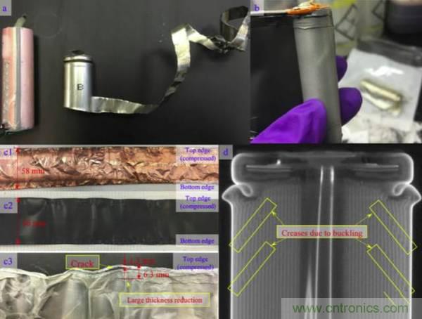 對(duì)試驗(yàn)后的18650電池進(jìn)行拆解顯示,雖然電芯發(fā)生了嚴(yán)重的變形,但是正負(fù)極并沒(méi)有發(fā)生斷裂,反而是隔膜在距離上部邊緣1.3mm的位置出現(xiàn)了一個(gè)裂縫,這直接導(dǎo)致了電池發(fā)生短路,電壓突降,而這一裂縫可能是由于金屬箔鋒利的邊緣侵入造成的。此外隔膜的在一些位置厚度出現(xiàn)了很大的下降,這主要是由于凹陷的外殼擠壓電芯造成的。