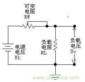 Uo=Ui×RL/(RW+RL),因此通過(guò)調(diào)節(jié)RW的大小,即可改變輸出電壓的大小。請(qǐng)注意,在這個(gè)式子里,如果我們只看可調(diào)電阻RW的值變化,Uo的輸出并不是線性的,但如果把RW和RL一起看,則是線性的。還要注意,我們這個(gè)圖并沒(méi)有將RW的引出端畫(huà)成連到左邊,而畫(huà)在右邊。雖然這從公式上看并沒(méi)有什么區(qū)別,但畫(huà)在右邊,卻正好反映了“采樣”和“反饋”的概念----實(shí)際中的電源,絕大部分都是工作在采樣和反饋的模式下的,使用前饋方法很少,或就是用了,也只是輔助方法而已。