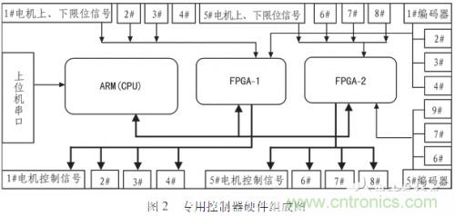 專用控制器由arm(LPC2214)、fpga(EP2C5T144C8)、驅(qū)動器接口電路、編碼器接口電路、限位檢測電路和電源電路等組成,如圖2為一個八軸電機(jī)控制器的硬件組成圖。arm通過串口實(shí)現(xiàn)與上位機(jī)之間的通信,解析從上位機(jī)獲得的控制指令,并通過fpga產(chǎn)生相應(yīng)輸出信號給驅(qū)動器接口,驅(qū)動器接口外接驅(qū)動器。編碼器信號作為位置反饋信號同編碼器接口相連,形成位置環(huán)反饋。限位信號作為安全檢測信號同限位檢測接口相連,為整個系統(tǒng)添加一道安全保障。