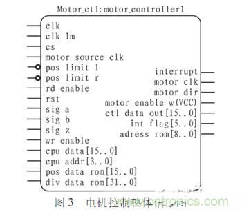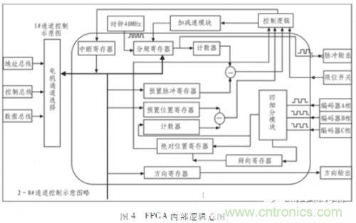 專用控制器在完成整個控制的過程中,arm只負(fù)責(zé)指令解析、控制指令發(fā)送、實(shí)時數(shù)據(jù)上傳等任務(wù),fpga才是多軸專用控制器的核心。通過Verilog HDL語言在fpga內(nèi)部實(shí)現(xiàn)了加減速曲線、編碼器信號辯向及四細(xì)分、絕對位移記錄等功能。圖3為電機(jī)控制的整體輸入、輸出信號圖,通過片選信號CS、讀有效信號rd_enable、寫有效圖信號wr_enable進(jìn)行電機(jī)通道選擇。圖4給出了1#通道控制的fpga內(nèi)部邏輯示意圖,下面將逐一對各主要模塊進(jìn)行詳細(xì)介紹。