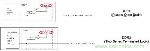 驅(qū)動(dòng)DRAM工業(yè)發(fā)展的一個(gè)主要市場需求是對(duì)內(nèi)存器件的低功耗要求。介于這個(gè)原因,DDR4引入了一個(gè)新的IO驅(qū)動(dòng)標(biāo)準(zhǔn),成為PSOD(Pseudo Open Drain)。在PSOD里,接收端將信號(hào)端接到軌電壓(VDD),而不是軌電壓的一半(VDD/2)。