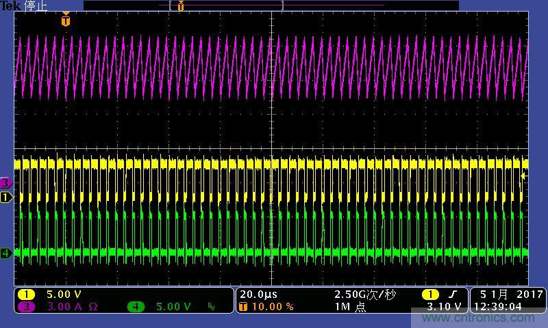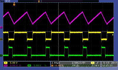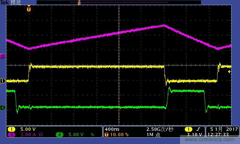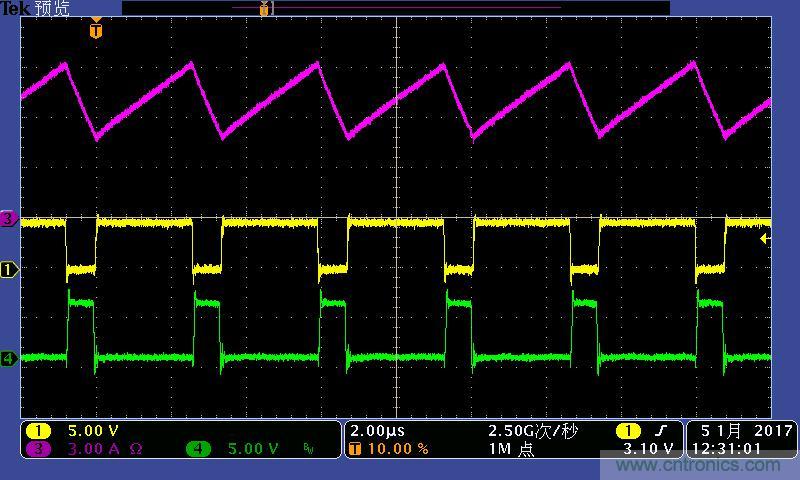 注:功率電感電流波形及高低端MOS管驅動波形。其中:①黃色:高端驅動波形;④綠色:低端驅動波形;③紫色:電感電流