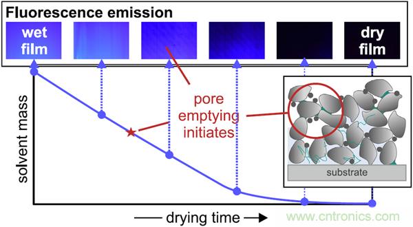 德國(guó)卡爾斯魯厄理工學(xué)院薄膜技術(shù)研究所的Stefan Jaiser等人引入了一種實(shí)驗(yàn)裝置,在涂層干燥溶劑蒸發(fā)過(guò)程中能夠測(cè)量涂層的收縮,涂層表面液體含量,以及表面孔洞消失的過(guò)程。在電極漿料中少量加入一種熒光增白劑,涂層中的液體在UV-A紫外線輻照下能夠發(fā)出藍(lán)光,因而可以用相機(jī)觀察到液相。圖像處理可以估算涂層表面的液體含量,跟蹤電極孔隙中的液相消失過(guò)程。同時(shí),濕涂層的厚度采用二維激光位移傳感器測(cè)量。實(shí)驗(yàn)結(jié)果揭示了液相去除,電極孔隙中開(kāi)始形成的時(shí)刻。