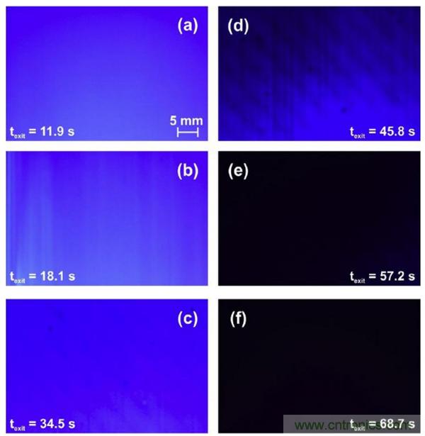 圖3.不同的干燥時(shí)間之后捕捉到的RGB圖像,干燥時(shí)間從(a)11.9s到(f)68.7s