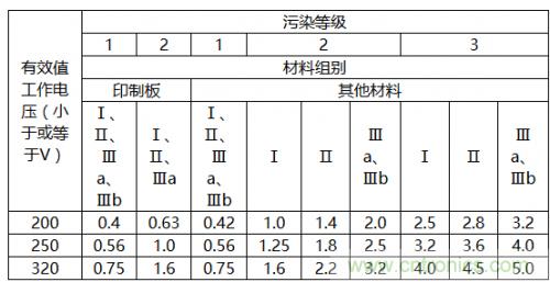 爬電距離是兩個(gè)導(dǎo)電體沿絕緣材料表面的最短距離,而最小爬電距離只由表格2N來(lái)確定;具體查表方法如下: