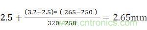 爬電距離計(jì)算:按照污染等級(jí)2、材料類(lèi)別Ⅲ可知265V有效值電壓在表2N的250V和320V之間,而250V時(shí)基本絕緣為2.5mm,320V的基本絕緣為3.2mm,即265V電壓基本絕緣為