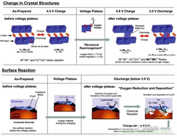 富鋰材料容量高,并且還具有低成本的優(yōu)勢,可以說是非常理想的鋰離子電池正極材料,當(dāng)然任何事情都不可能是完美的,在首次使用的過程中為了發(fā)揮出富鋰材料的高容量,要采用高電壓活化,這一過程中除了形成我們需要的Li2MnO3物相外,也會生成Li2O,還會釋放活性氧,這不僅會破壞富鋰材料自身的結(jié)構(gòu),還會導(dǎo)致電解液的氧化分解,造成較高的不可逆容量。此外富鋰材料在循環(huán)過程中還存在著層狀結(jié)構(gòu)向尖晶石結(jié)構(gòu)轉(zhuǎn)變的趨勢,這也導(dǎo)致富鋰材料的電壓平臺在循環(huán)過程中會持續(xù)的下降,容量不斷衰減,使得富鋰材料循環(huán)性能較差,反應(yīng)機(jī)理如下圖所示。