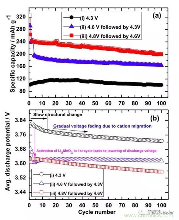 富鋰材料活化制度是影響其循環(huán)性能的一個重要因素,以色列科學(xué)家Prasant Kumar Nayak等研究顯示,活化電壓和循環(huán)電壓對于富鋰材料的循環(huán)性能都有十分顯著的影響,例如他們發(fā)現(xiàn)Li1.17Ni0.25Mn0.58O2在經(jīng)過4.8V活化,并在2.3-4.6V之間循環(huán)的電池,雖然容量高達(dá)242mAh/g,但是循環(huán)性能很差,并且循環(huán)100次后電壓平臺從3.62V衰降到了3.55V,而經(jīng)過4.6V活化,并在2.3V-4.3V之間循環(huán)的電池,雖然比容量較低僅為160mAh/g,但是循環(huán)性能優(yōu)異,并且循環(huán)100次未出現(xiàn)平臺電壓衰降,如下圖所示,而沒有經(jīng)過高電壓活化的材料,容量較低僅為100mAh/g左右,可見富鋰材料的活化制度和循環(huán)制度對于富鋰材料的循環(huán)具有巨大的影響。