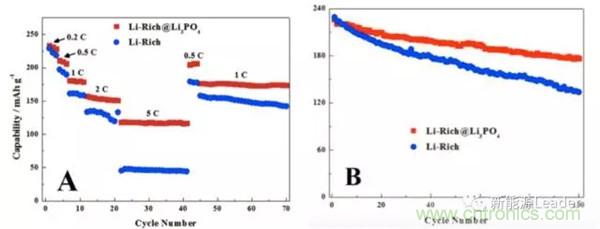 華南師范大學(xué)的Dongrui Chen等借助聚多巴胺模版法,利用Li3PO4對富鋰材料進(jìn)行了包覆處理,Li3PO4包覆層的厚度僅為5nm左右。Li3PO4包覆層極大的改善了富鋰的材料的循環(huán)性能,0.2C,2.0-4.8V循環(huán)100次,容量保持率為78%,而沒有經(jīng)過包覆處理的富鋰材料容量保持率僅為58%,同時Li3PO4包覆層也顯著提高了富鋰的材料的倍率性能,如下圖所示。