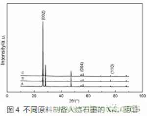 圖4是不同原料、相同制備工藝制成的三種人造石墨A、B、C的XRD圖譜,由圖4可知:A、B、C三種材料的主峰位置基本相同,均位于26°2θ角附近,說明經(jīng)過高溫石墨化處理后的A、B、C三種材料形成了石墨晶體的六方晶型結(jié)構(gòu)。