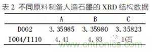 表2是不同原料制備人造石墨的XRD結(jié)構(gòu)數(shù)據(jù),由數(shù)據(jù)可知:A、B、C三種材料的D002值依次減少,說明三種材料的石墨化程度依次升高;I004/I110值依次升高,說明三種材料的取向性依次變差。這與原料的偏光測(cè)試結(jié)果是一致的。取向性好的材料嵌鋰的速度更快。