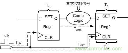 如圖 6所示,為分析建立時間/保持時間的基本電路圖。Tclk1為Reg1的時鐘延時,Tclk2為Reg2的時鐘延時,Tco為Reg1固有延時,Tdata為Reg1的到Reg2之間組合邏輯的延時,Tsu為Reg2的建立時間,Th為Reg2的保持時間,設時鐘clk周期為T,這里分析數(shù)據(jù)的建立時間和保持時間。