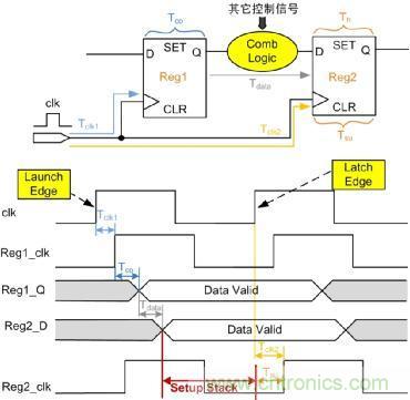 如果建立時間的裕量Setup Stack小于0,則不滿足建立時間,也就會產(chǎn)生不穩(wěn)定態(tài),并通過寄存器傳輸下去。