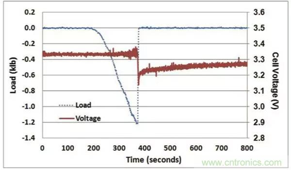 為了方便讀者理解本文,下圖是給出了LFP電池一個非常典型的成功通過機械擠壓測試(正反饋)的判據(jù),電池擠壓變形達到一定的程度后,引起了電池內(nèi)短路的發(fā)生,電池電壓迅速下降,檢測到電壓下降后(0.1V),擠壓力隨之被移除,電池的電壓快速回升,電池沒有發(fā)生熱失控,則電池通過擠壓實驗。