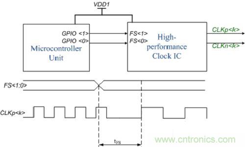 高性能時(shí)鐘設(shè)備支持包含個(gè)性化配置的多個(gè)用戶配置文件。在 FS 引腳轉(zhuǎn)換方面,高性能時(shí)鐘器件具有兩個(gè)時(shí)序規(guī)格 - 快速切換和慢速切換。