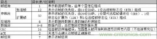 目前使用最廣泛的CAN-bus網(wǎng)絡(luò)標(biāo)準(zhǔn)是V2.0版本,該標(biāo)準(zhǔn)又分為A、B兩部分,它們主要的區(qū)別在仲裁區(qū)域的ID碼長(zhǎng)度。其中CAN2.0A(標(biāo)準(zhǔn)幀)為11位ID,CAN2.0B(擴(kuò)展幀)為29位ID。下表1為CAN報(bào)文結(jié)構(gòu):