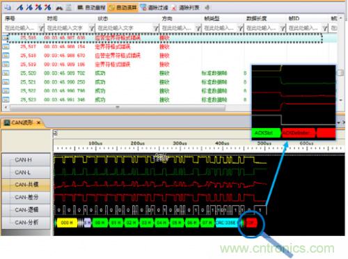 為什么會(huì)發(fā)生這種錯(cuò)誤呢?發(fā)送報(bào)文的節(jié)點(diǎn)會(huì)在ACK段發(fā)送兩個(gè)隱性位,若在第一個(gè)位期間接收到顯性電平則認(rèn)為該幀被正確接收。由于仲裁段相同時(shí)兩節(jié)點(diǎn)都認(rèn)為自己取得仲裁權(quán),在ACK段等待應(yīng)答,但該網(wǎng)絡(luò)中僅存在兩個(gè)節(jié)點(diǎn),因此在ACK段不能收到應(yīng)答,進(jìn)而發(fā)生應(yīng)答定界符錯(cuò)誤。簡(jiǎn)單說來這種情形就類似于總線中只有一個(gè)節(jié)點(diǎn)將不能實(shí)現(xiàn)數(shù)據(jù)發(fā)送。圖7是在ACK段有無(wú)應(yīng)答時(shí)的波形對(duì)比。